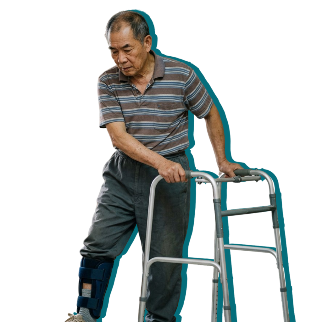 65 歲的張先生在中風康復初期,最令他苦惱的是右腳出現「垂足」(Drop Foot)現象。由於負責腳踝背屈的肌肉無力,他走路時腳尖經常拖地,不僅容易絆倒,為了避免跌倒,他不得不抬高髖部以「劃圈」方式代償行走。長期下來,不僅走得慢且容易疲勞,更導致腰部及健側膝蓋出現代償性疼痛。